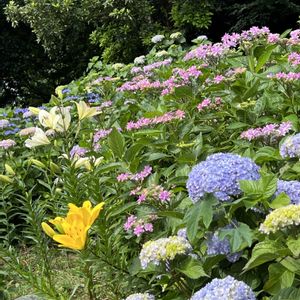 可睡ゆりの園 ② スカシゆりに沿って 森の中へ入りますと そこには紫陽花が咲き乱れて いまして、ユリと競演する不思議な空間へと惹き込まれてしまいました