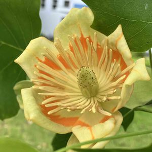目に青葉〜2024🏷 3種めは、「ユリノキ」で。 散歩途中の大きなユリノキ🌳。肉眼では分かりにくい花。✕6のズームでやっと、黄色にオレンジの花が見える。 4枚めの葉っぱ、職人が身に纏うハンテンに似ている事から、別名ハンテンボク🏷。 (2024/5/11撮影)