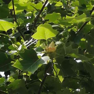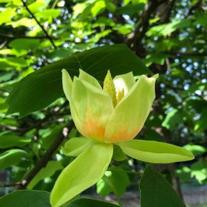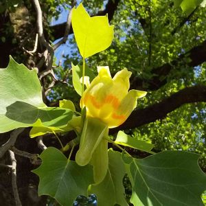 ユリノキの花 別名チューリップツリー ユリよりもチューリップの方が頷ける気がします👀 高い樹上で葉に隠れ気づきにくいかも、ですが、可愛いです💕💕 新宿御苑のシンボルツリーの一つですが、臨時閉園前に撮れて良かったです😄