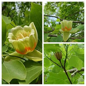 大きな木の高い所に咲くので なかなか近くで見られないモクレン科の ユリノキの花 近くに高台がありそこに登って近くで見ることができました。 別名 チューリップツリー チューリップの形に 似ていますね。 葉っぱの形も 特徴あり すぐわかります。右下は花の後です。