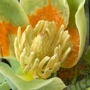 💛ユリノキの花💛 モクレン科ユリノキ属 落葉高木 別名…チューリップツリー 花びら(5cmぐらい)の付け根近くに🧡オレンジ色🧡の模様があります 萼片は3枚、雌しべが円錐形に集合していて、周囲を多数の雄しべが取り囲んでます