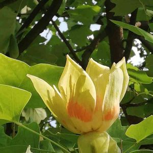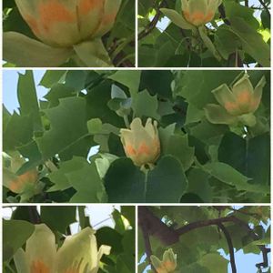 ユリノキ(Tulip tree) モクレン科ユリノキ属 毎年、近くの公園で見られます。 初めて見たときは変な花と思いましたが、毎年毎年見ていると愛着出てきて、最近ではこの黄緑色の花弁にオレンジ色の斑がとても可愛く見えてきました♬ そして今回初めて花弁の中までのぞいて見ました🤗 とても大きな木で葉っぱも特徴あります。Tシャツのような、半纏のような形をしているお洒落な葉っぱです♬