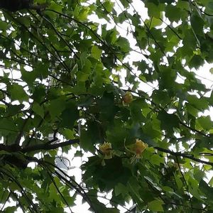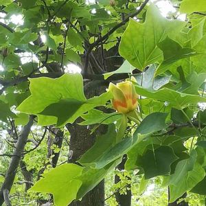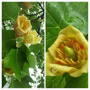 ユリノキの花.. 見上げるような高木なので👀📷✨は難しく..下向きに垂れた枝から奇跡的に発見..急いで📷パチリ..チューリップのような形で可愛らしい..