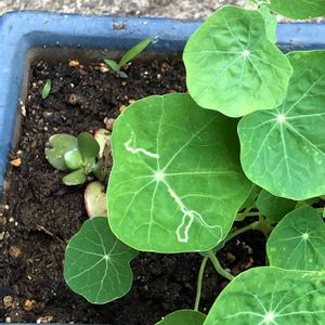 何やら虫の歩いた跡が ナメクジさんでしょうか? 実家の母に種から芽だしを 頼んでしまいました 親心のカネノナルキが そっと添えてあります 白い模様はエカキムシさんの仕業だそうです ミセスRさんに教えて頂きました