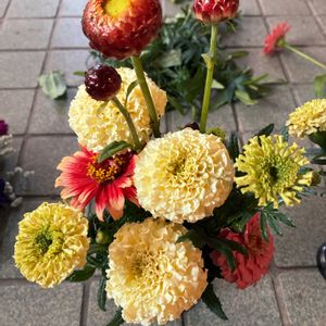 《今日の仏花》 ①②仏花用に✨️ 花材はアフリカンマリーゴールド、ジニア、ヘリクリサム❁⃘*.゚ ③他の花材は玄関用に🌸 アスター、ヘリクリサム、 ジニア、スターチス アスターがこれにて終了🥹 今後の仏花はまだまだ元気なアフリカンマリーゴールドをメインにしようかな❓ 蕾をたくさん付けてる菊も 楽しみ🥰