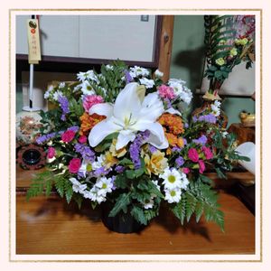 お世話になった叔父の三周忌の法要がありました。 遠方なのでお墓にも位牌堂にもなかなか行けず久しぶり行ってきました お寺の中にある位牌堂にお水がいらなくてお世話が簡単なプリザーブドフラワーを使ったドームタイプの仏花をお供えに✨ 故人を偲ぶ気持ちが大切なので生花ではないから失礼 ではないみたいです🫶🏻 叔母も親族の方も喜んでくださり お坊さままでとても褒めてくださり私も嬉しかったです。 お供えに悩んだけど作って良かった♡ #お供え#プリザーブドフラワーアレンジメント #プリザーブドフラワーお供え花 #プリザーブドフラワーお供え#法事#法要#お盆#お彼岸#仏花