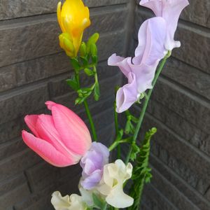 こんにちは😊 今日は祖父の月命日です👴 昨日切り花を買ってきました💐 フリージア、スイートピー、チューリップ🌷 春っぽい明るい色にしました🌸 今日は朝から冷たい雨だけど😅☔️ 今日も1日元気に過ごせますように🍅