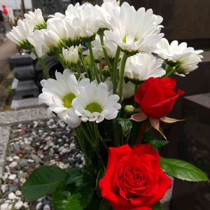 今日は祖父の月命日🪦 昨日買ってきた白い菊と わが家の赤いミニバラをお供えしてきました🌼🌹 白い花が好きだった祖父👴 私が育てたお花を供えるのは初めて✨ センスがなくて生け方も知らないけど💦 喜んでくれるといいなぁ🤗