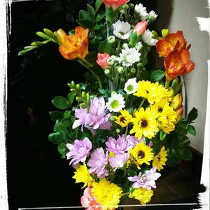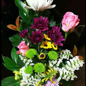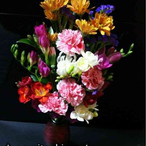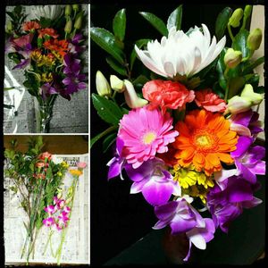 仏花です。 家で咲いたお花を利用しました。 八重咲きフリージア ラナンキュラス 赤と黄色のラナンキュラス。 思ったより赤は深紅で、黄色はオレンジに近い山吹色。 八重咲きフリージアは黄色と白。 まだピンクと赤に黄色のボカシが入るものは咲いてません。楽しみにしてます。 お花を摘んでいたら丁度ご近所さんが通り掛かってお花のお話になったので、咲いているお花を簡単に花束💐にしてプレゼントしました。 最近のマムはガーベラみたいだったり 、ダリアみたいだったり… ホント、アレンジに使っても長持ちして素敵です。 みなさまがご近所さんだったら、お花のお裾分けができるのにねー( *´艸`)