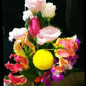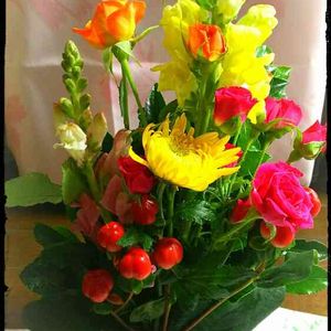 出来上り完成🙌✨ 父が好きなピンク・赤系の花束💐風の仏花🌸 グロリオーサを、不動明王の火焔のようなイメージで使いたかったのです。 中々難しいです。 次回も挑戦、勉強です トルコキキョウ、バラ、グロリオーサ、ピンポンマム、デンファレ、千両 (庭に生えているもの)、ビシャコ