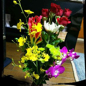 父のお仏壇のお花🌷です。 買い物に行った母が、あまりいいお花🌷がなかったの~🙈と落胆🙍⤵して帰宅🏠🚗💨したので。 仕事終わりにお花屋さんに行ってキレイ✨だと思うお花🌷を買ってきました。 今日は再利用なく全部取り換えました。 グロリオーサ、大菊、スプレーバラ、スプレーマム、オンシジウム、デンファレ、ビシャコ 本当は違うお花🌷を目当てにしていたのですが、夕方遅くだったのでありませんでした😅💦 もっと派手に赤いグロリオーサをバリバリ使って、父の好みの赤い花束をイメージしていたのです。 母に止められました!! 次回はわたしの思うようにお花を入れるぞ👊✨💨