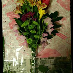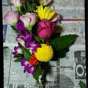 一部花が悪くなってきたので組み直しをしました。 百合、デンファレ、スプレーマム を新たに足しました。 大菊、フリージア、スプレーマム ビシャコ は再利用。 デンファレ10本が250円… 迷ったけれど、安さには勝てず購入(・・;φ テーマは…特になしです(笑)