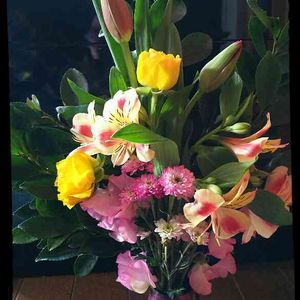 出来上りです😆 黄色のスプレーバラ🌹、白とピンクの小菊は再利用。 金魚草、黄色の大菊、ピンクのスプレーバラ🌹、ビシャコを新しくしました。 バラ🌹が好きだった父の為、本来は仏花にバラ🌹は入れませんが、今回はバラ🌹を中心に。 いい蘭があれば、蘭も入れてあげたいです😆✌