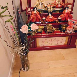 雛飾りに合わせて、今年は初めて桃の花を購入してみました🎎 一足早い春の雰囲気🌸