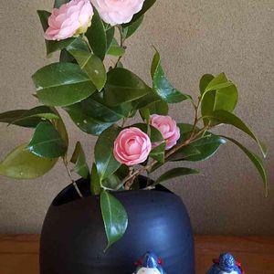 乙女椿がポツリポツリ咲いています。陽が当たるとすぐに茶色っぽくなってしまう😔 土鈴のお雛様と一緒に飾りました。