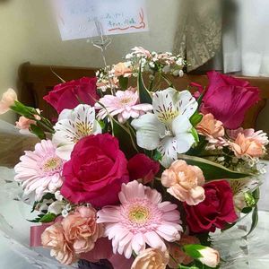 フォトメールから1枚♪ 退院のお祝いで贈られるというオーダーです。 カラフルにというご注文なので、かわいい色合いとちょっぴりシックな色合いを取り混ぜてまとめました。 こちらはLサイズなので仕上がりが大きめです♪