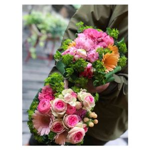 おはようございます。 今週は暖かい穏やかな日頑張り続きそうですね。☺️ 頑張っていきましょう🤗 、 退職祝いのブーケ。 ピンク系で可愛く😊