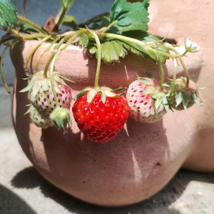 鉢植えから こんにちは☀ 左 🍓よつぼしいちご 右 🍓女峰 水撒き🚿に出たら 手前の花鉢を避けると 赤色🍓見つけました 2025.7-34