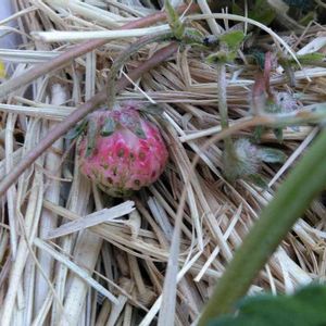 昨年親株から伸びたランナーが、地面のあちこちに数株定植。栃乙女か女峰。 これは女峰かな。 ボチボチ取れてます。