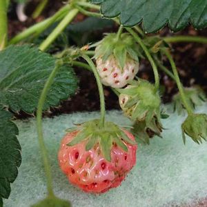 女峰がだいぶ色づきました🍓 真っ赤もかわいぃけど、淡い色や白地に種だけ赤いのも、かわいぃ💕 女峰の選び方に『色が鮮やかで円錐形のものを』とあった… この子は熟してもオススメされないね(^_^;) でも、かわいぃ🎶