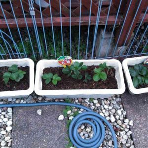 苺🍓の苗、植えましたよ💕 初めての苺🍓づくりに挑戦します❣️ 来年の春、真っ赤な苺に会えるのが、楽しみです。冬越しが心配ですが🧐❗️ 素焼きの鉢、義母さんが沢山持っていた物を再利用していきます。