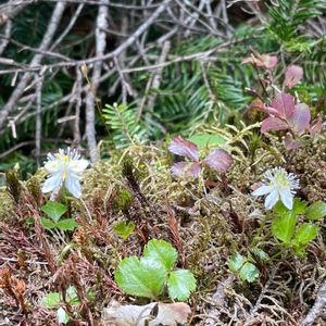 おはようございます😊)^o^( 🌿🤍ミツバオウレン🤍🌿💓🏔️(๑・̑◡・̑๑) 登山道で見つけて、うっとり😍 険しい岩山でしたが、ミツバオウレンに パワーもらいましたぁ🥰💓 キンポウゲ科オウレン属の多年草。 高山植物。別名、カタバミオウレン。 2023.6.17 男体山⛰️