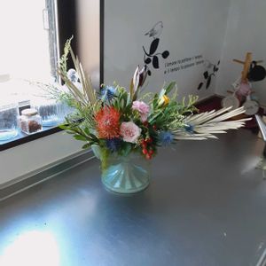 先日、娘からの花束💐の後ろに、チラッと見えた、ひまわり🌻のアレンジです😊 見たいなぁて言ってくださった方、ありがとうございます😍 日が経ち、右側下にあった水色のデルフィニウムがほとんどなくなり、ひまわり🌻も枠からはみ出てますが(言い訳です😆) 年に何回か参加させてもらう、アレンジ教室で作ったものです😆 ひまわり🌻は、明るくて、いいですね〜❣️ 明日も暑くなりそうです😅 ひまわり🌻には、いいですね〜😆☀️