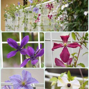バラが終わろうとしている時、ようやくクレマチスが咲き始めました🌼 同時には咲いてくれませんね😅 左上から、アフロディーテ・エレガ・フミナ、マダム・ジュリア・コレボン、プリンスチャールズ、アルバ・ラグジュリアンスです。まだ株が若いので、フェンスいっぱい、というわけにはいかないです😊