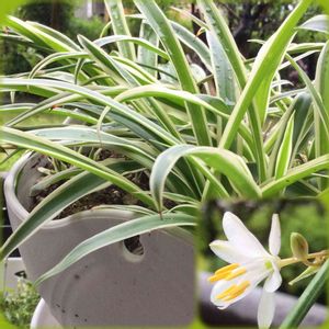 オリヅルラン 予報どおり朝から結構な量の☔️です まだこれから本格的に降るようです😖 恐るべし😖オリヅルラン 初めて凍ってしまって ダメになっていたけど😂 そのまま放っておいたら😱 🌱が出て花まで咲き出して👀 生命力強いんだぁ😊 2鉢とも復活していました🎶