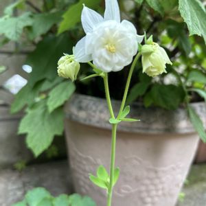 オダマキ タワーライトブルー🩵の種を購入して蒔いたら、真っ白のオダマキが咲きました〜 これはこれできれい☺️ でももう2つの苗もホワイトの予感〜