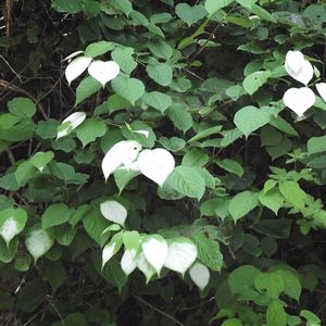 葉が白くなるマタタビ 猫がゴロニャンと陶酔する。ほんとです。 昔、薬用酒を造ろうと実を沢山取ってきて、虫食いを捨てて造ったら笑われた覚えがあります。😓