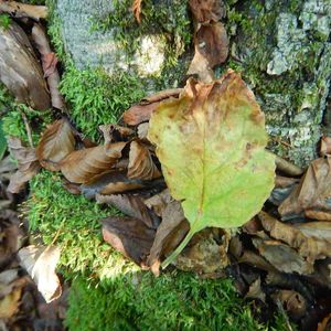 気になっていながら、わからないままの葉っぱです。 こんな写真一枚で教えて下さいと言うのも失礼な話ですが、何の葉何でしょう 1枚目です 木曽 10月末 標高1200m