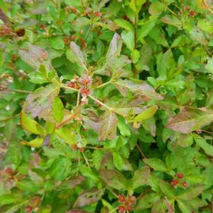 この灌木は何でしょうか。 高圧鉄塔の立つ尾根が切り拓かれていて、日射しのよく届く広場になっていました。 その鉄塔線のために皆伐された場所に灌木が育っていました。よく見ると、小さな花が、咲いています。続けてあと2枚投稿します。 1枚目 飛騨 標高900m
