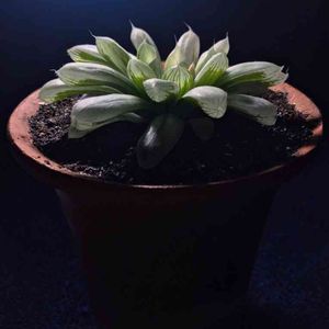 ハオルチア 白水晶です!1週間ほど前にうちに到着しました!元々は2.5号ほどの小さいプラ鉢に植わっていたので植え替えました!白水晶はもともと徒長しやすいようですが、この株も相当徒長してますね(^^;) 工夫して出来る限り徒長を改善させてみようと思います!中央に花芽がありますが、通常のハオルチアに比べると花芽も白っぽくてやはり伸長も緩やかです。 植え替えに使った鉢は4号の素焼きラン鉢です。元々根がこの鉢の3〜4割ほどの長さだったので、まだ倍以上は根の成長分のゆとりがあります。土は上の方まで盛ってありますが、これはもう少し浅くても構いません。ただ、このように上の方まで盛ることで、窪んで乾きにくくなることによる小虫大発生を結構抑えることができます。 ハオルチアが元気に育たなくて困っている方がいらっしゃったらこんな風に植えるのをおすすめします!今までプラ鉢で植えたり鉢を改造したりしましたが(笑)今の所これがベストです!そのうちまとめに書こうと思いますが、素焼き鉢等についてもし質問ありましたらコメントください(^^) これ、たくさん増えたら何日か前に投稿したオブツーサのような植え方にして人にプレゼントしたら喜ばれるかな〜なんてわくわくしながら育てています!(^ω^)あ、あげる人がいなかったwww