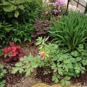 🌿マイガーデンの片隅は宿根の娘達の居場所になってます。 姫ウツギ・オオデマリ・芝桜・キスゲ・ヒューケラ・フリージア・タイツリ草・オダマキキリガミ・アストランチアなど少しずつ、賑やかになり始めました。