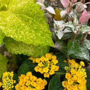 ランタナ バンダナ🌼 寄せ植えしたコリウス レモンキャンディ☘️の緑が眩しくて。。 かわいい初雪かずらも一緒に。。 どんなふうに成長していくのか楽しみです☺️