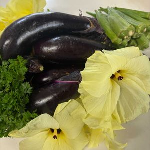 美味しい頂きもの〰️✨🥰 頼んでいたお米をとりに行ったら、お野菜頂きました! ナス🍆いっぱいとオクラとパセリ 黄色のお花は🌼花オクラ 初めての出会いです! サラダに入れたりあえもの,おひたしに出来るって〰️ ③のゴーヤはお隣から伸びて来た子 いつ収穫したらいいかわからなくて 今朝見たらこんな色になってた😿🙄🫢 でも食べられるそうです! 最後は今朝の薔薇💖💕💝 可愛いピンク色 今日も良き日で〰️✨🌿🌳