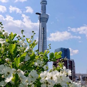 今日の散歩🚶♂️ 亀戸辺り🚶♂️ 白い花が 👀‼️ なんだろう❓️そう言えば、ここは リキュウバイが街路樹としてたくさん 植えられている場所🌳 この木だけ数輪咲いてました🎵