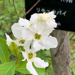今日の花散歩👣🐾🌼🤍🌼🤍💚✨ リキュウバイの真っ白な花びらが…きれいで…思わずパシャ…していました… バラ科… 純白マニア…🏷付けました… 🤍🌼💚(ӦvӦ。)💚🌼🤍