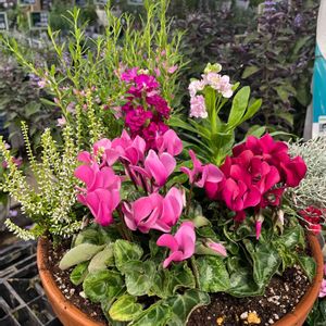 昨日は30度を超え蒸し蒸し暑いのに🥵 来ちゃいましたー💧 ガーデンシクラメン🌸 高温🥵多湿🫠最悪です。 少しでも目をひくようにと👀定番苗で寄せ植えを作りました。 ガーデンシクラメン2色 ストック2色 カルーナは白 後方にピンク花のサザンクロス 右端にシルバーのプラチーナです。 少しでも、蒸れを防ぐため、株間を取って、ガーデンシクラメンは高植えしました😊
