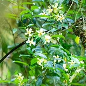 カズラに巣を作って雄雌交互に子育て中。周りに花も咲いて華やかですね!今いるのは雄です。