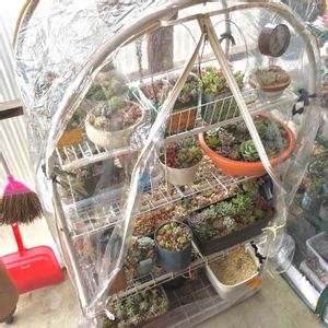連投すみません😅 うちの玄関の簡易ハウス① ここが1番日当たりが良いハウス だから、お気に入りの子や 綺麗になってほしい子を入れてる✨ 大きめの寄せ植えや 葉挿しトレーもここにin☝️ 玄関で多肉をいじるから 🧹とちりとりは必須😂 あとこの隣と内側の玄関に 4段の簡易ハウスが1台ずつあります!