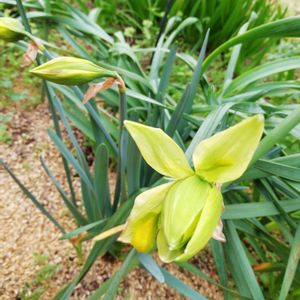 八重咲き水仙フォンシオンの 三姉妹は─ パッと咲く気配が見られず こんな感じです😓 開花とは言えないかな🤔