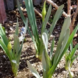【八重咲き水仙】やっとここまで伸びました ฅ^ΦωΦ^ฅ まわりには、【プスキニア】 別名【氷の妖精🧚】が植えてあります (੭ु ›ω‹ )੭ु⁾⁾♡共に植えっぱなしでOK