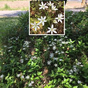 こんばんは もう一枚、名前を教えてください。 この白いお花、職場の北側に咲いています。 半日陰です。 桜の木の下、広い場所にたくさん。 ご存知の方、教えてください。 教えていただきました。 なんとこんこんさんと、ゴンゴンさんに😊 オオニソガラム(和名:オオアマナ) だそうです。 ありがとうございます💕