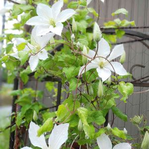 最近雨が多いです☔昨夜は激しく隣の田んぼは池のようになってます🐸 クレマチスがたっぷりの雨で元気に咲いてくれました🥀 ①壁面誘引のミケリテ💜多花性のようでとても綺麗です✨ ②ジョン•ハスクタブルとアバンギャルド🥀ジョンさんは白でかなり大きめのお花です✨ ③アバンギャルドは昨年はほとんど咲かず、ほぼ初開花です✨名前は派手なイメージでしたが、可愛くておしべがもう一つのお花がある感じに見えますね💕