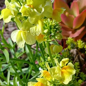 おはようございます。 🏷️日曜ビタミンカラー♪ 💛色のリナリアさんです。 💛色のデカいパンジー、ボニータさんです。花びらが、大きいので、沢山咲いていると、ちょっと笑えます。(˶ᵔᵕᵔ˶)🐱🐾