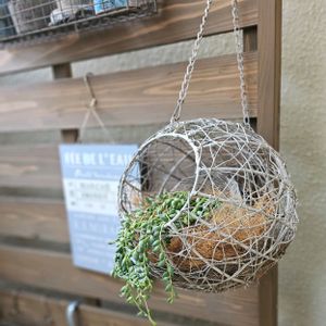 * こちらは瀕死状態だったグリーンネックレスを状態の良いものと入れ替え♪ かたい容器だと入れにくいので、誰かがやってた百均の可愛い水きりゴミ袋へ植え込んで入れました! なかなか良いアイディア👌 * #グリーンネックレス #多肉植物 #ハンギング