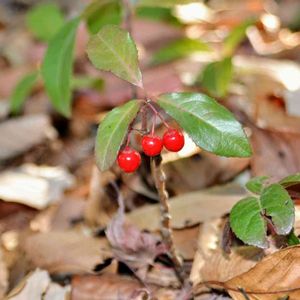 自然観察園にて 藪柑子(ヤブコウジ) 何度も投稿してますが、可愛くて大好きなんです。 古典園芸植物の一つで、江戸、明治時代に鉢物が大流行したそうです。