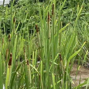 今日のお花 ★ヒメガマ(姫蒲)★ ガマ科の抽水植物 花期:6〜7月 川岸、沼のほとり、休耕田、湿地など、浅い水辺に生える。草丈は1.5~2m程度。葉はガマに比べて細く、葉幅は1cm程度。雄花と雌花の花穂が離れており、その間に緑色の軸が見える。 ガマがフランクフルト🌭なら、ヒメガマは細長いウインナーみたい😋 2025.6 都立水元公園にて📷️